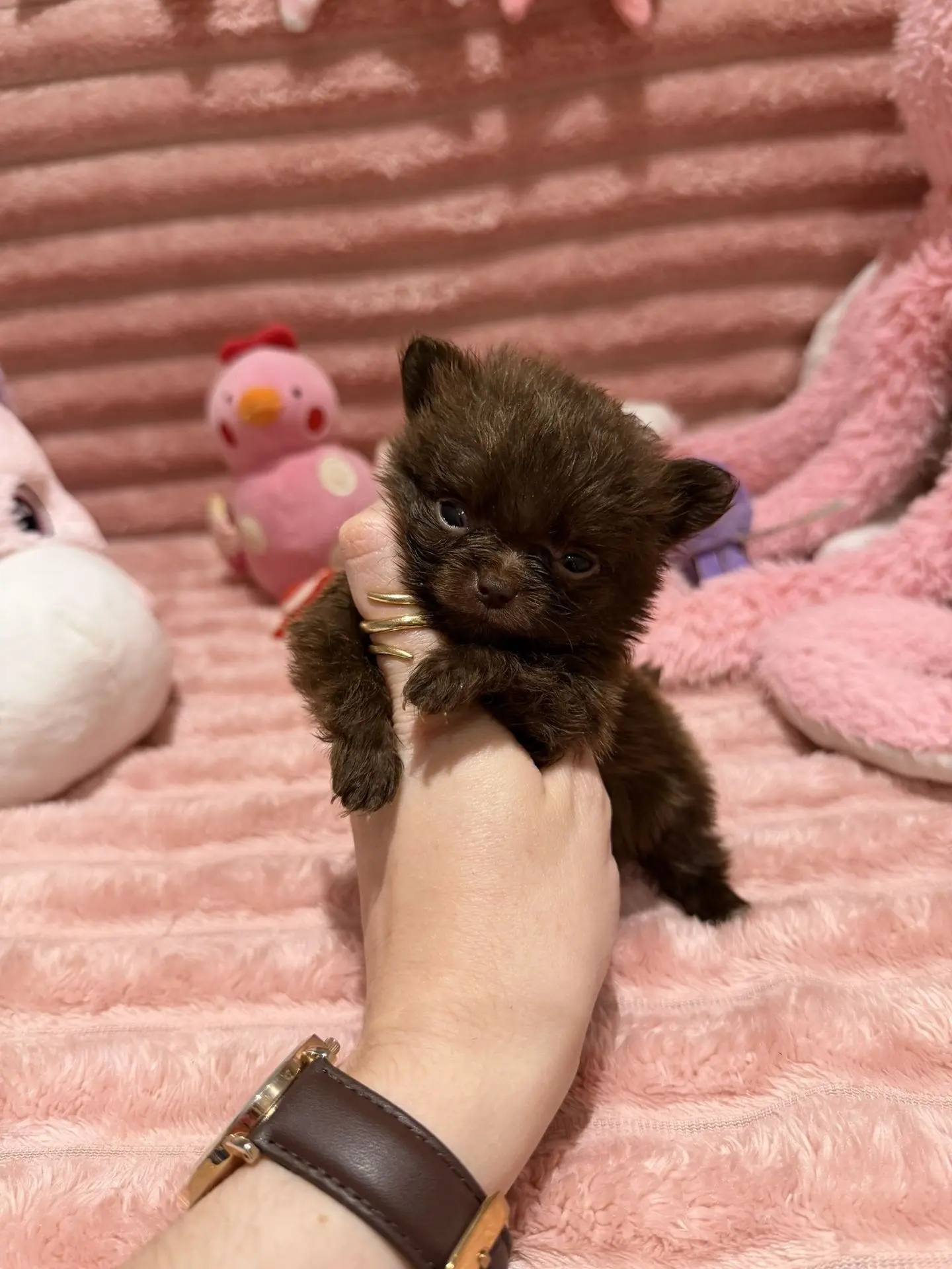 Je suis Aurore, une adorable Spitz naine typée Poméranien, de couleur chocolat, et je promets de rester très petite 💕 Un vrai petit format plein de charme !