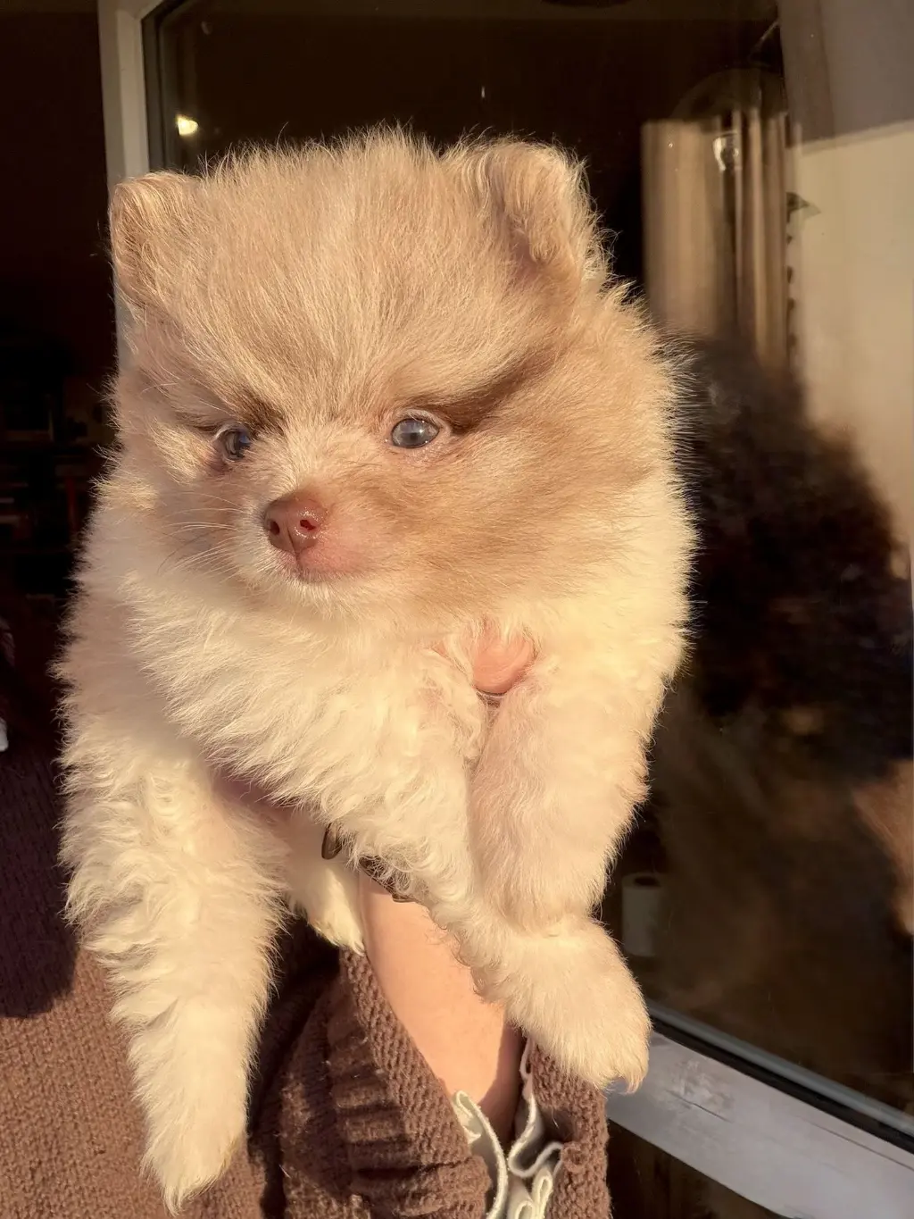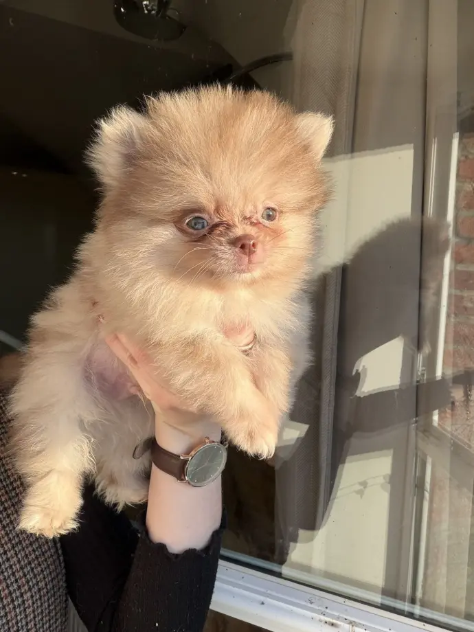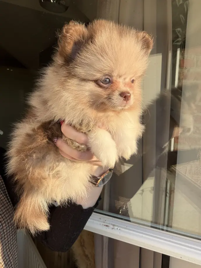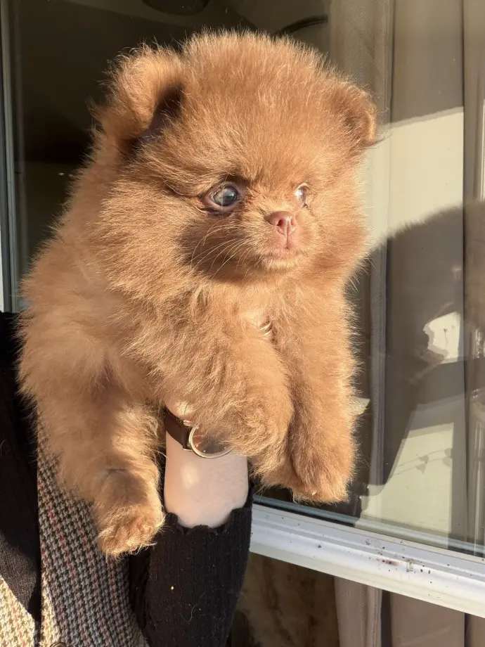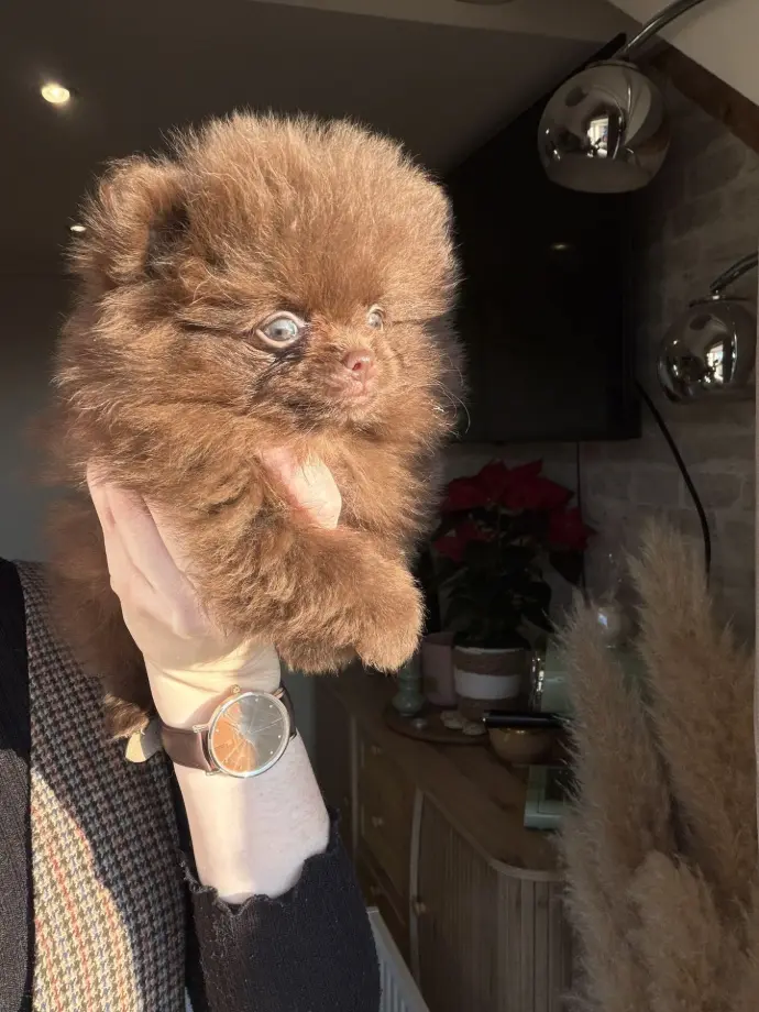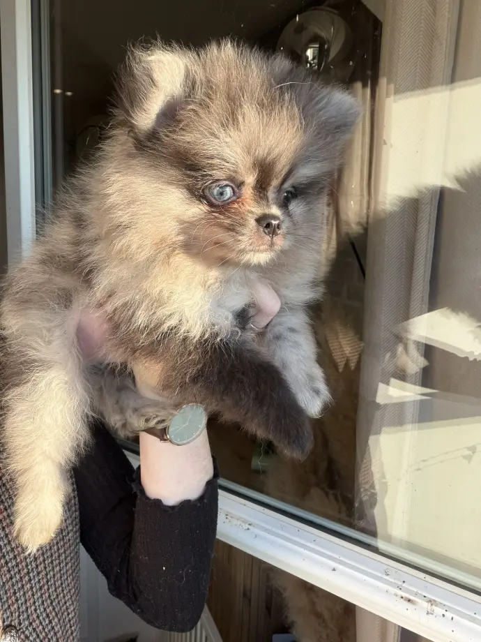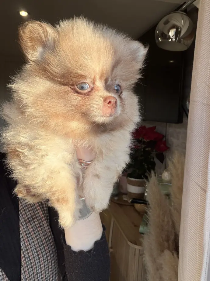 Je suis une adorable Spitz naine typée Poméranien, de couleur merle chocolat dilué. La couleur de mes iris va encore évoluer, mais il semblerait que mes deux yeux soient verts, ce qui me donne un regard doux et expressif.