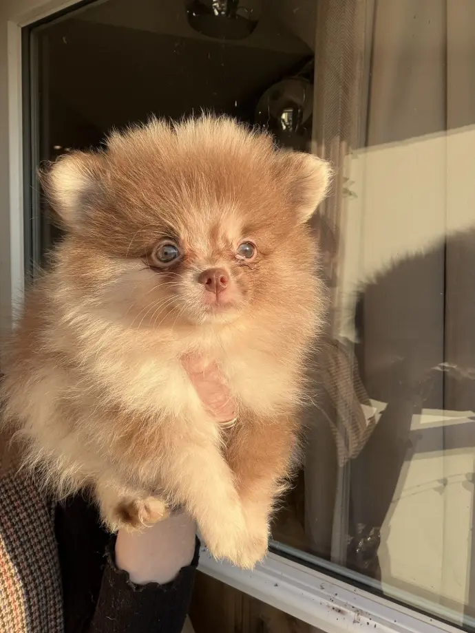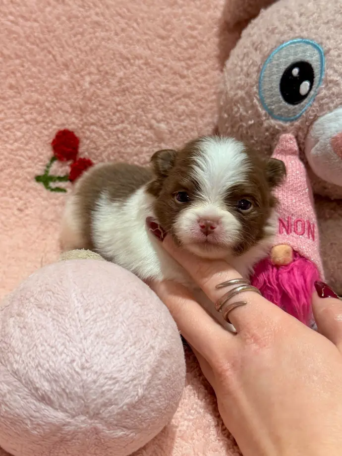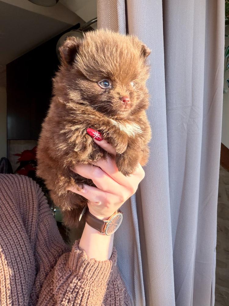Je suis une adorable Spitz naine typée Poméranien, de couleur chocolat avec un joli plastron blanc, et je promets de rester très petite, tout comme ma sœur Aurore 💕