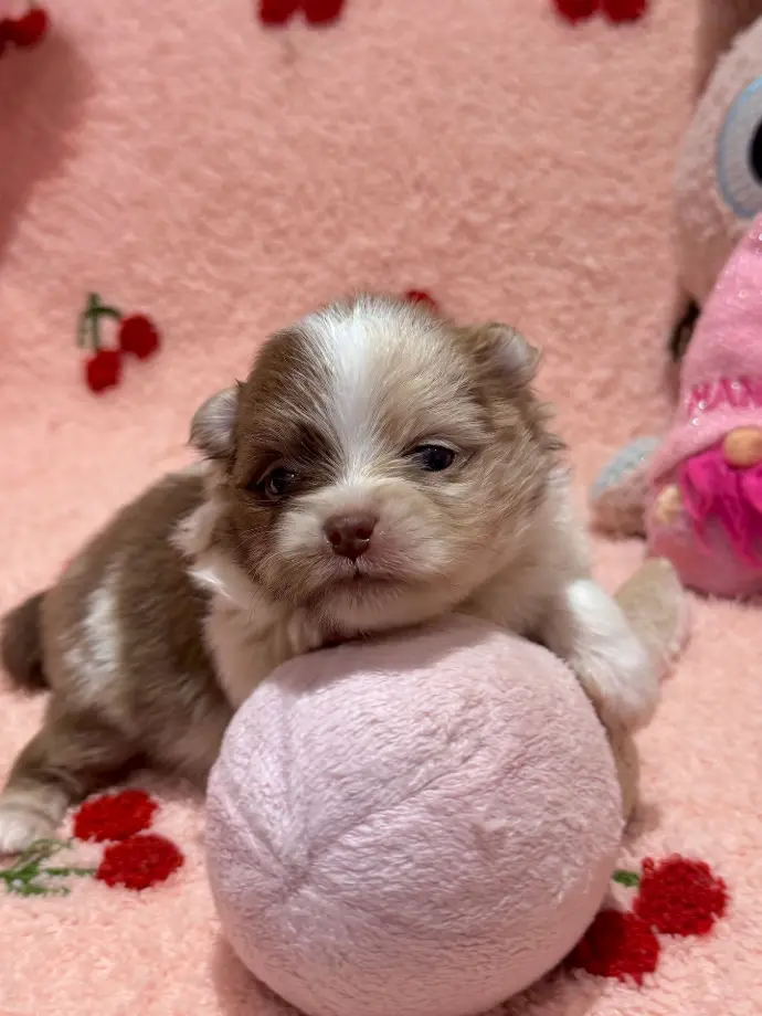 Atlas fait lui aussi partie de notre toute première portée de 2026. Issu du même travail de sélection passionné et minutieux, il se distingue par une robe particolore chocolat absolument remarquable. De type poméranien, il est estimé nain.