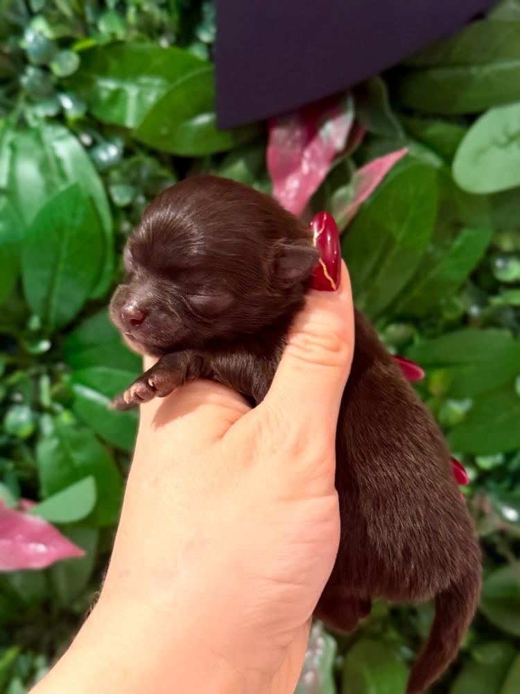 Je suis un magnifique Spitz nain typé Poméranien de couleur choco avec un plastron blanc. Je suis le plus petit de la portée, mais ne vous y trompez pas : derrière mon petit gabarit se cache une présence pleine de charme qui fait fondre tous ceux qui me rencontrent.